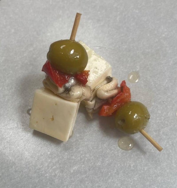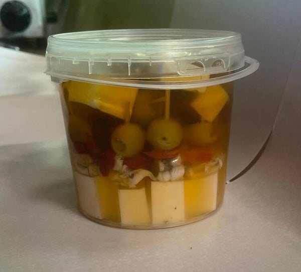 Pinchos una deliciosa combinación de Queso de Oveja, aceituna Rellena de Anchoa, boquerón y pimiento rojo, aceite semi/picante. Perfectos para un bocado lleno de mucho sabor!!.