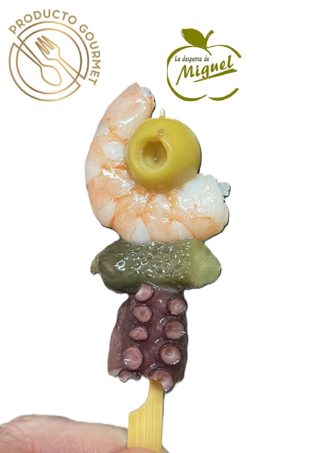 Pincho de Pulpo y Langostino cocido, con pepinillo y aceituna de gran tamaño rellena de Anchoa. se puede completar cubos con articulos variados.
