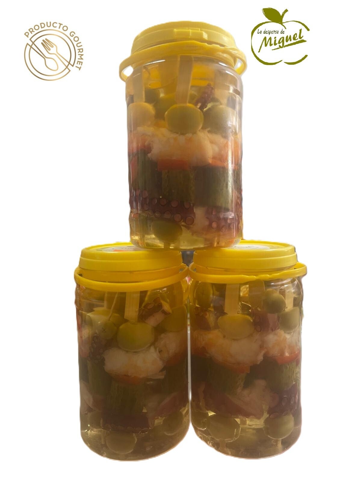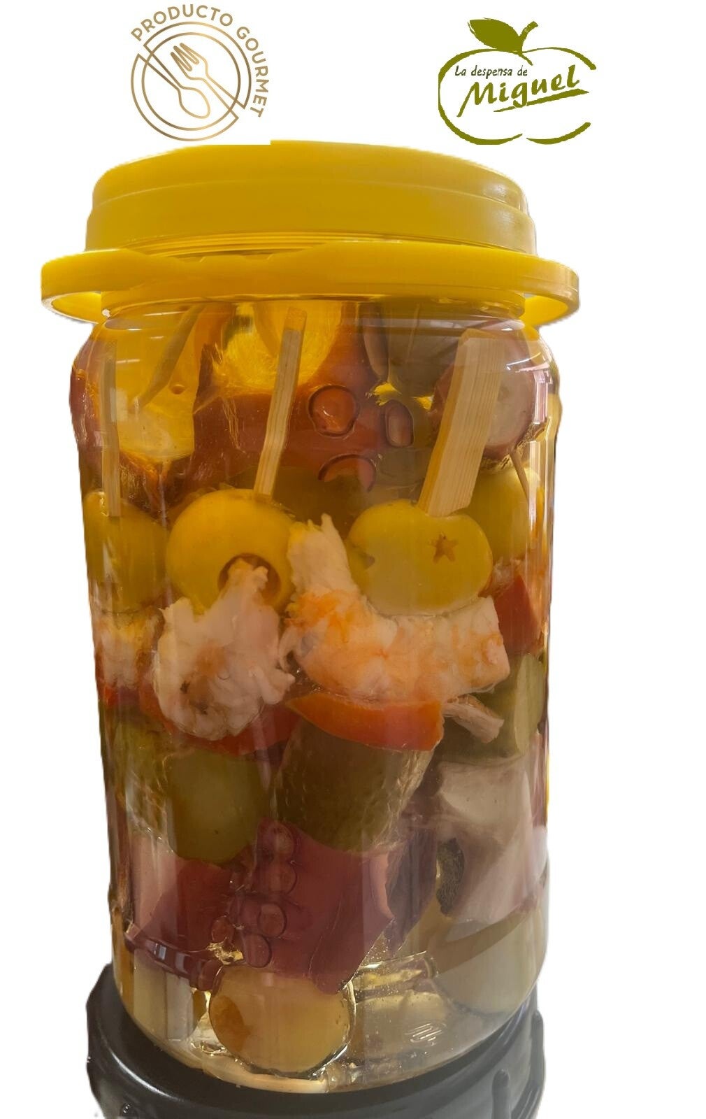 PINCHO. SUPER DE LANGOSTINO BANANA Y PULPO, aceituna con anchoa, pepinillo.